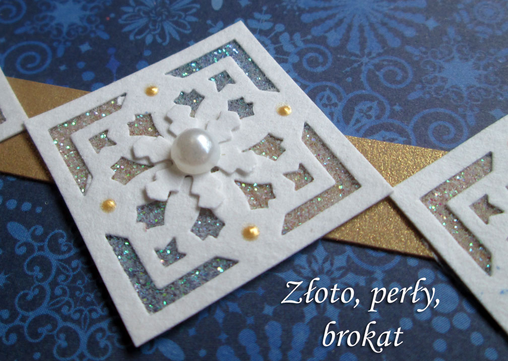 Kontynuując temat bogatości... zbudowałam kartkę z kwadracików opisywanych kilka dni temu. Ze złotem i perłami. Lubię takie geometryczne zestawienia, choć klientela (na przykład fraucymer na zakładzie) stanowczo woli psiuńcie, krówki i myszonki.